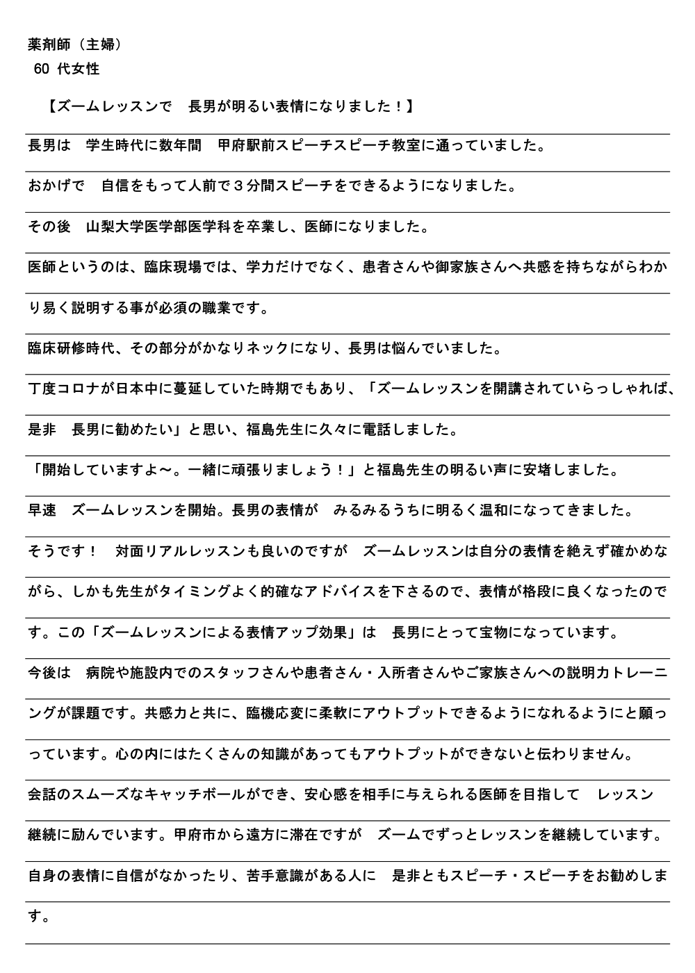 グループレッスンで同じ悩みを持っている仲間と気持ちを共有することで恐怖心が薄れます。そして毎回のレッスンで実践を重ね、人前で話すことによって自然と悩みを克服できるプログラムになっています。